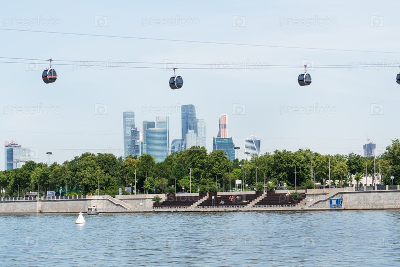 Московская область, Россия - 25 июня 2020 года: Канатная дорога Москва Воробьевы горы, Лужники. Панорамный вид на деловой центр города Москвы