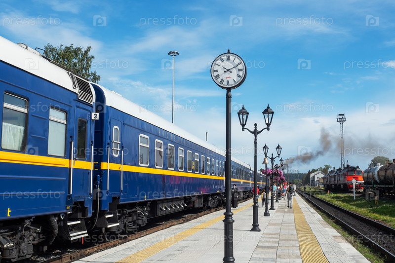 Сортавала, Россия - 7 августа 2020 года: Железнодорожная станция Сортавала и ретро-вагоны следуют по маршруту Сортавала-Рускеала