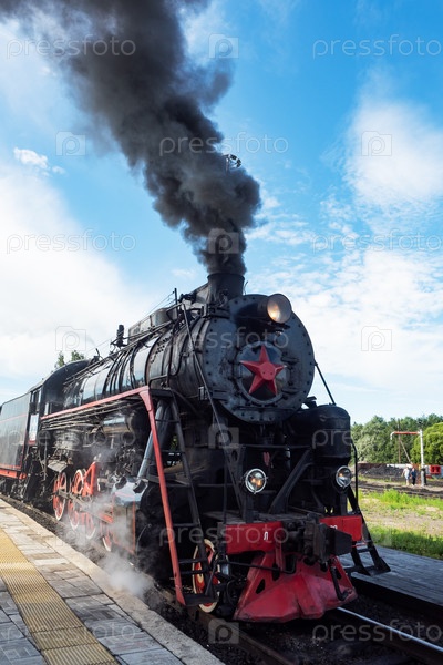 Сортавала, Россия - 7 августа 2020 года: Ретро-локомотив с черным дымом от угольного топлива стоит на железнодорожной станции и готов отправиться по маршруту Сортавала - горный парк Рускеала