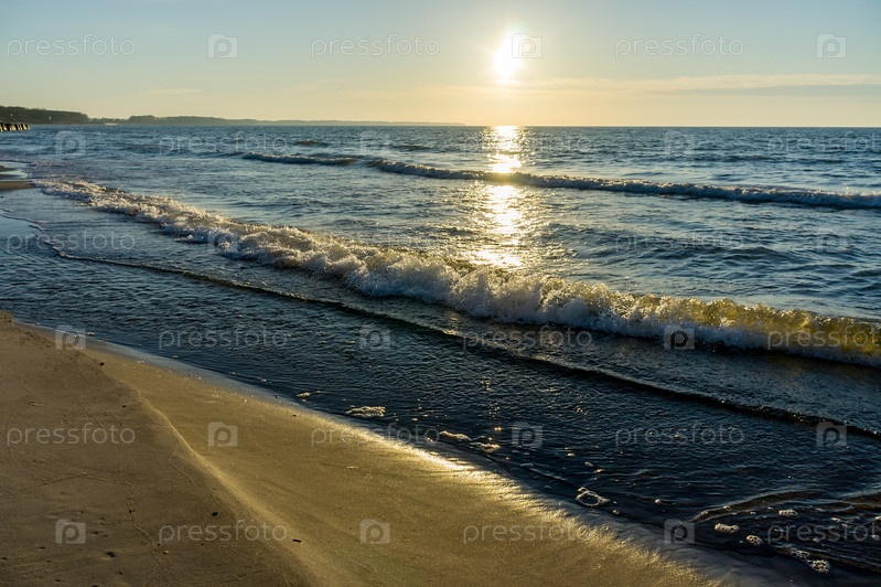 Закат над морем. Красно-желтое небо в лучах заката. Отражение солнечного света в морских волнах