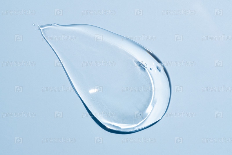 Текстура глицеринового геля. Прозрачная капля сыворотки на синем фоне. Жидкий гель-увлажняющий крем с пузырьками макроса