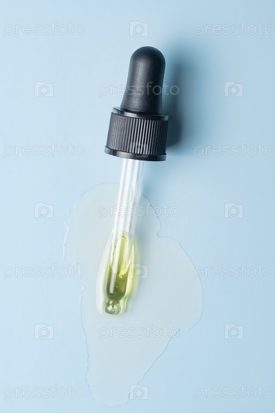 Крупный план пипетки с льющейся жидкой сывороткой и тенями на синем фоне. Модная косметика с жесткими тенями