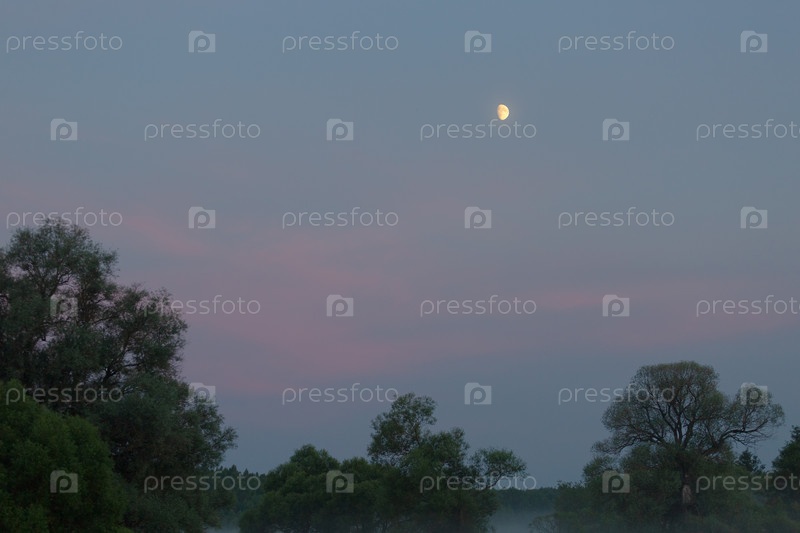 Растущая луна на закате над деревьями в тумане