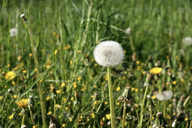 Одинокий пушистый одуванчик на лужайке с зеленой травой и летающими одуванчиками