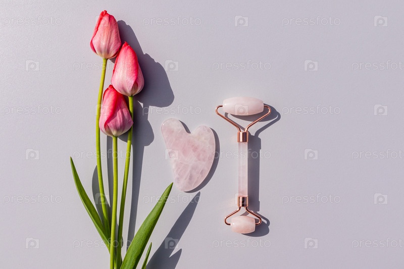Вид сверху на роликовый массажер из розового кварца и гуа-ша на сером фоне с живыми тюльпанами. Копировальное пространство. Концепция ухода и красоты