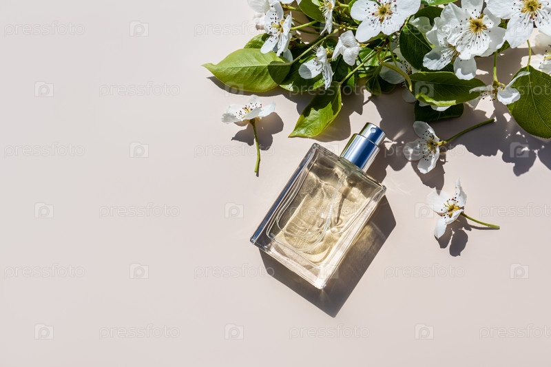 Элегантный флакон косметического спрея или духов на светлом фоне среди ветвей деревьев. Солнечный лучик. скопировать пространство. вид сверху