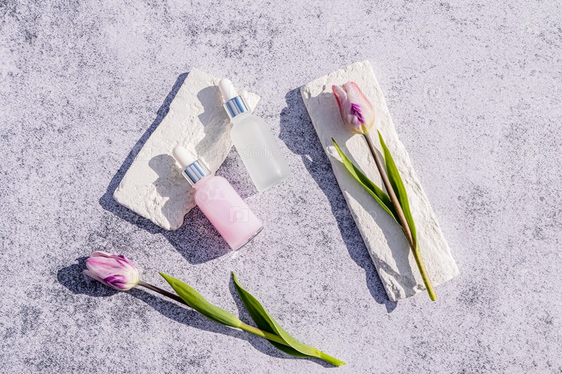 Два матовых флакона-капельницы с натуральным продуктом для повседневного ухода за кожей лица на мраморном фоне с тюльпанами. Концепция ухода и красоты