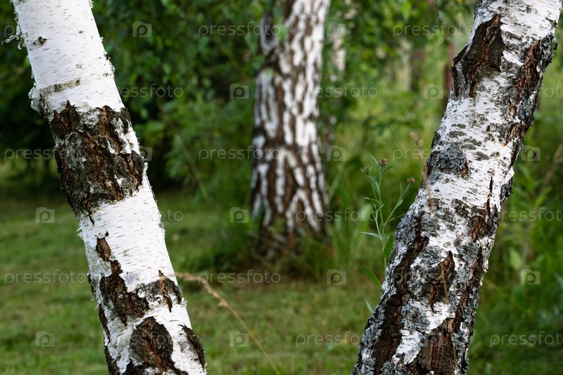 Два ствола березы крупным планом на фоне зелени и третьего ствола