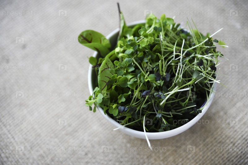Зеленый салат в чашке на мешковине. Травяной салат на желтом фоне