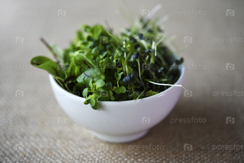 Зеленый салат в чашке на мешковине. Травяной салат на желтом фоне