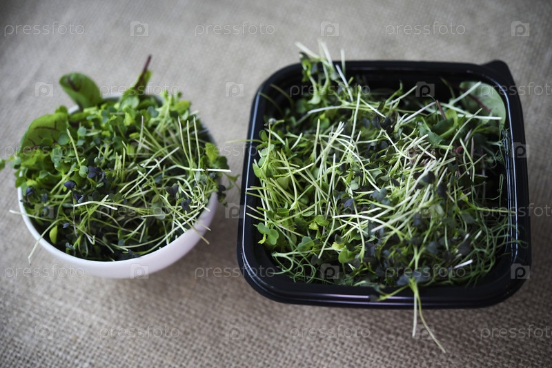 Зеленый салат в чашке на мешковине. Травяной салат на желтом фоне