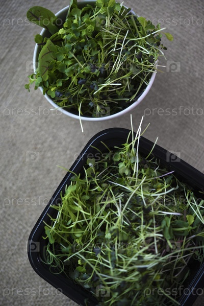 Зеленый салат в чашке на мешковине. Травяной салат на желтом фоне