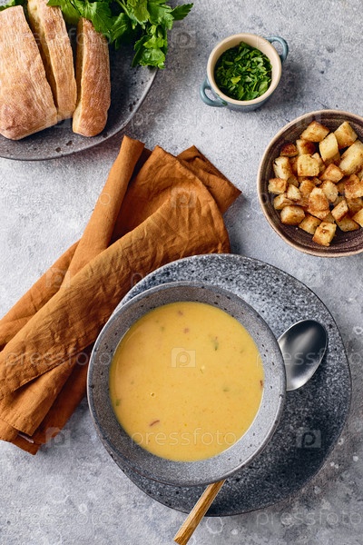 Миска картофельного супа-пюре с гренками, петрушкой и молотым красным перцем и ложкой на тарелку