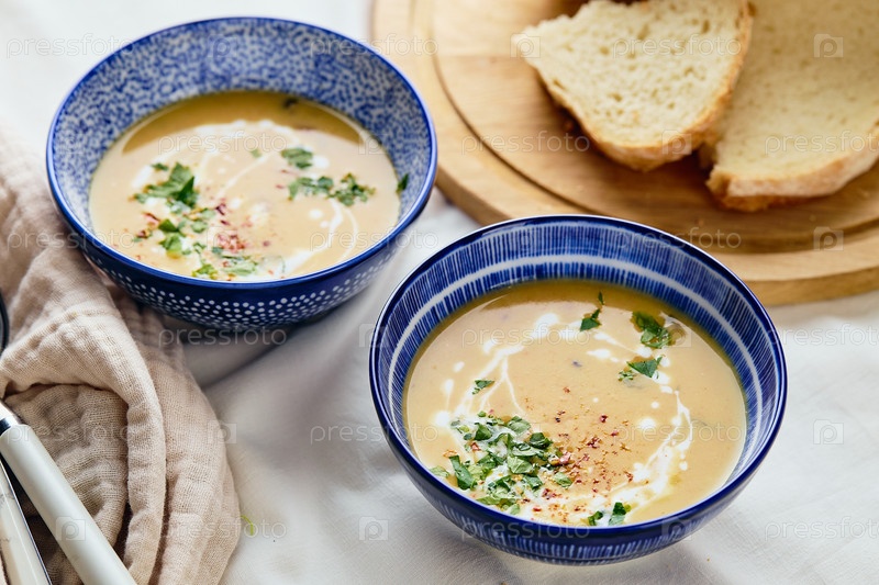 Две тарелки сливочного картофельного супа, ложки, салфетка и деревянная разделочная доска с буханкой хлеба и нарезанными кусочками. Поверхность супа украшают сливками, гренками, петрушкой и молотым красным перцем