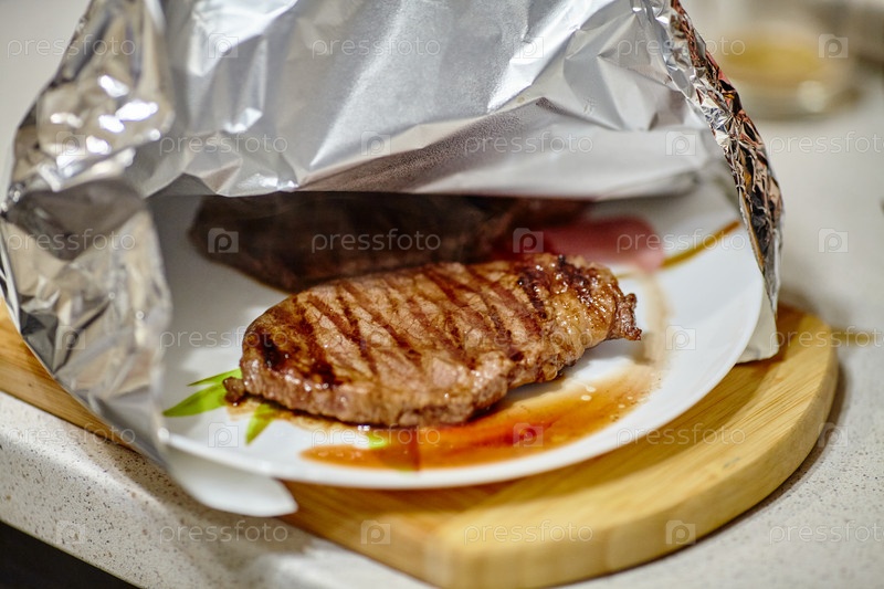 Стейк на гриле под алюминиевой фольгой перед подачей на стол