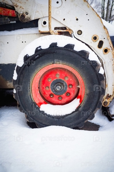 Колесо транспортных средств дорожной службы покрыто снегом, крупным планом
