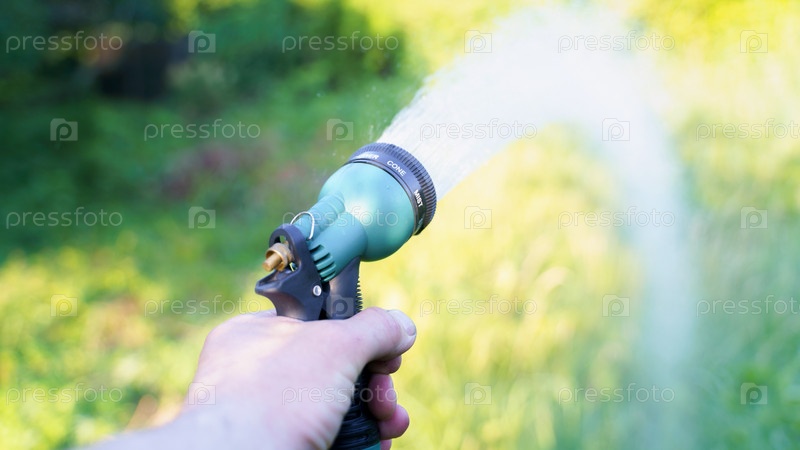 Садовник поливает сад из насадки из шланга
