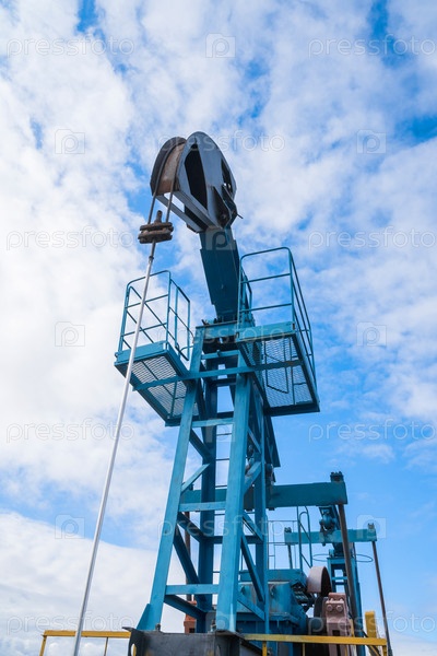 Масляный насос на фоне голубого неба и утреннего солнца, солнечные блики на масляном насосе