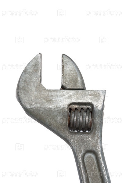Старый гаечный ключ с болтом на белом фоне