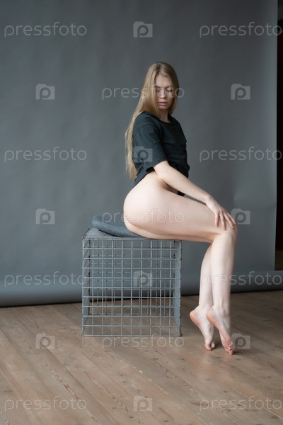 Молодая красивая женщина позирует в сером нижнем белье в студии