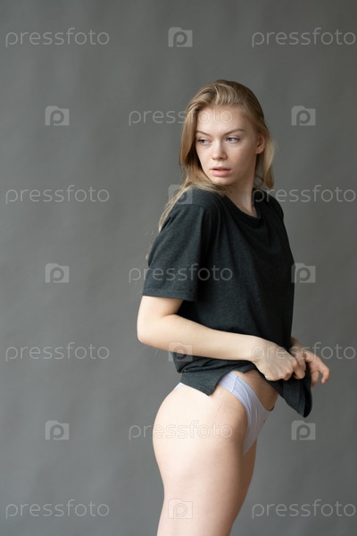 Молодая красивая женщина позирует в сером нижнем белье в студии