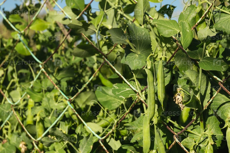 Спелые стручки гороха на кусте перед сбором урожая. Выращивание овощей в саду