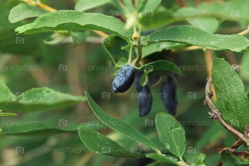 Спелые голубые ягоды жимолости на кусте. Выращивание садовых растений