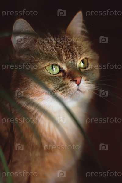 Коричневый кот на темном фоне смотрит вдаль