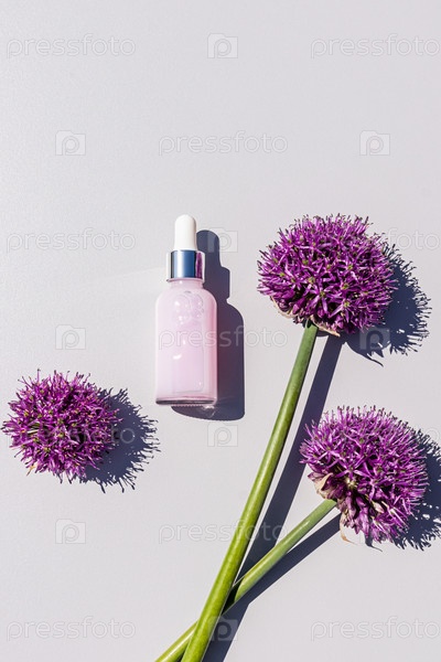 Сыворотка с натуральными ингредиентами для ухода за молодой кожей на сером фоне среди сиреневых декоративных цветов лука. Вертикальный вид сверху