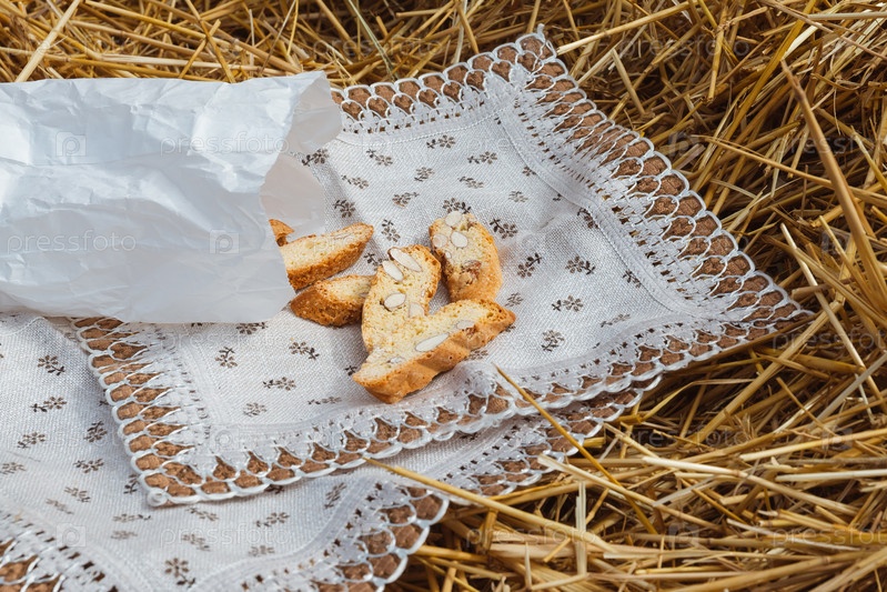 Крекеры из миндального печенья с кусочками орехов выпали из бумажного пакета на салфетку, лежащую на соломе