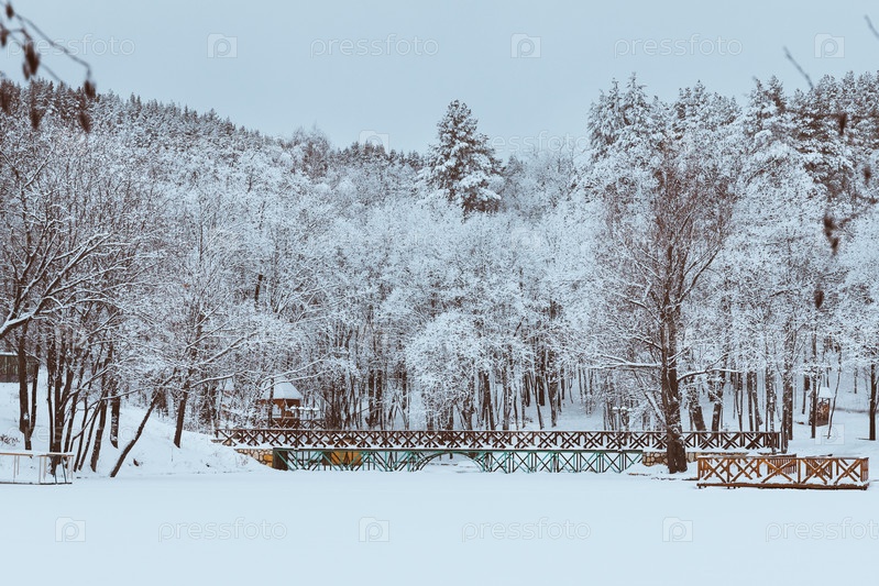 Зимний пейзаж с мостом и деревьями, покрытыми инеем