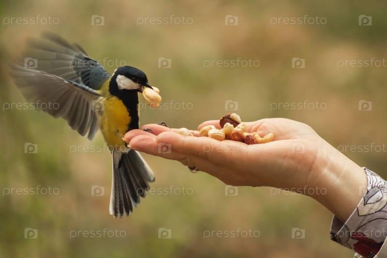 Синица в полете берет из руки женщины целый орех кешью. Снимок крупным планом с длинной выдержкой, показывающий движение крыльев птицы