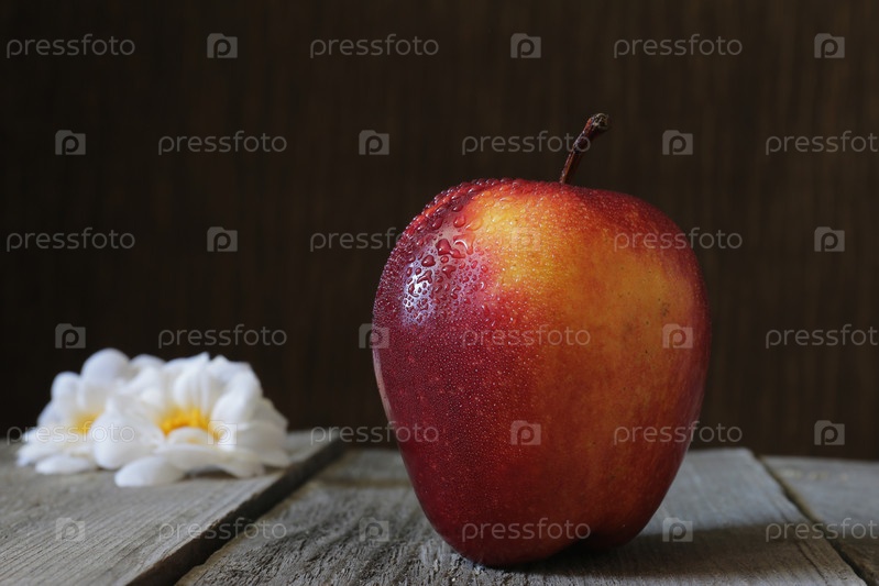 Красное яблоко и цветы на деревянном столе