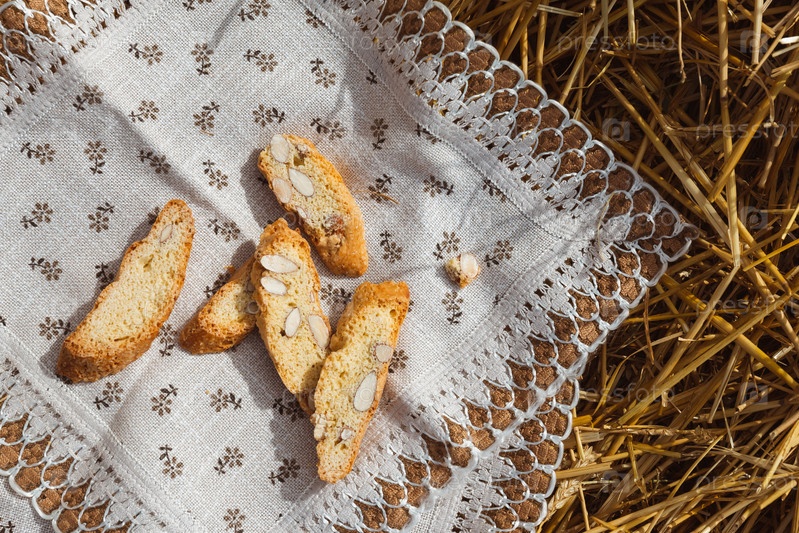 Крекеры из миндального печенья с кусочками орехов лежат на салфетке на фоне соломы, вид сверху