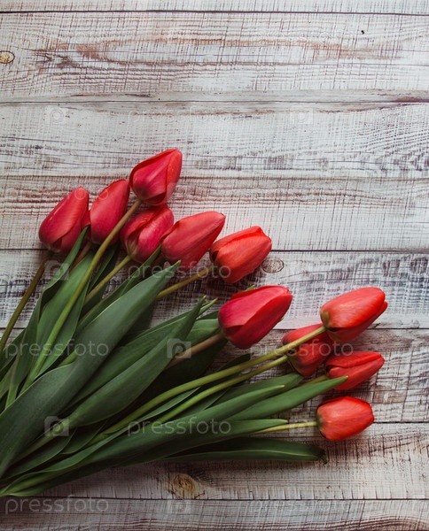Красные тюльпаны с листьями лежат на деревянном фоне
