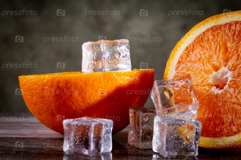 Апельсин и лед. Свежевыжатый ледяной сок. Фруктовая свежесть апельсина