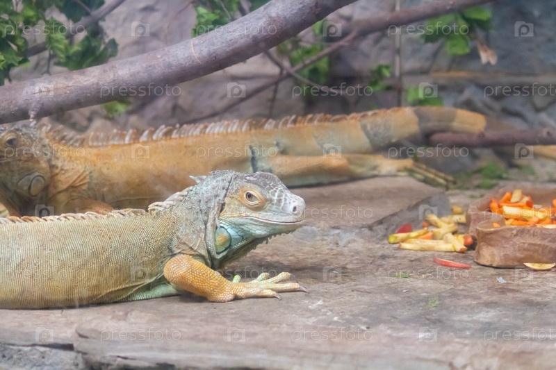 Игуана в вольере крупным планом. Кормление рептилий в зоопарке
