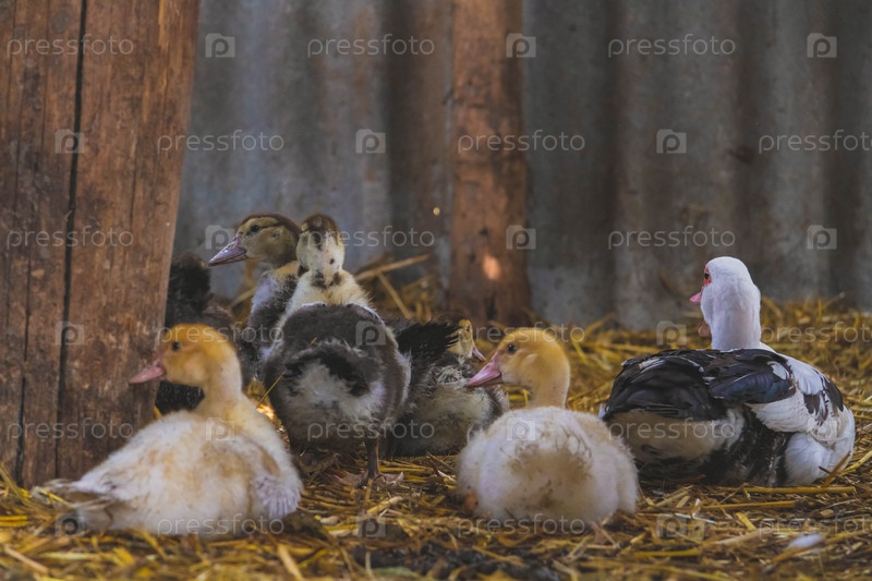 Гослинг. Птицефабрика по разведению гусей. Маленькие гусиные цыплята в траве