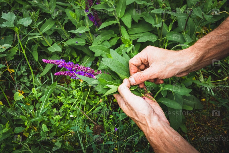 Сбор лекарственных трав. Травник собирает шалфей. Лечение травами