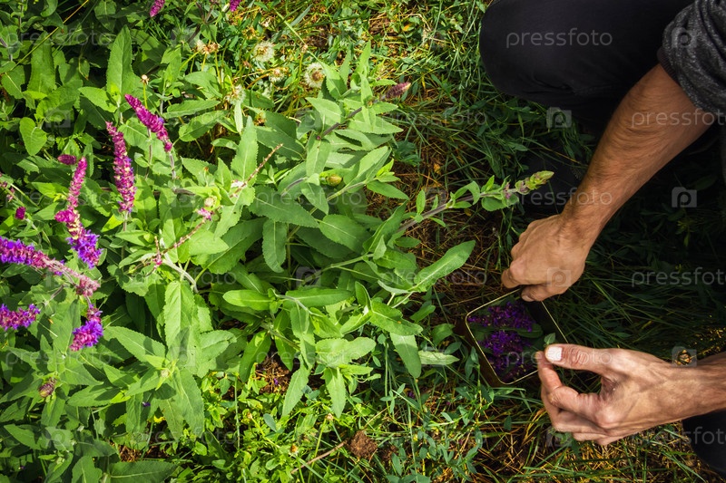 Сбор лекарственных трав. Травник собирает шалфей. Лечение травами