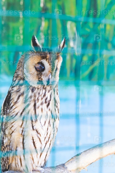 Совы в клетке в зоопарке. Сова на открытом воздухе. Милая сова сидит на ветке
