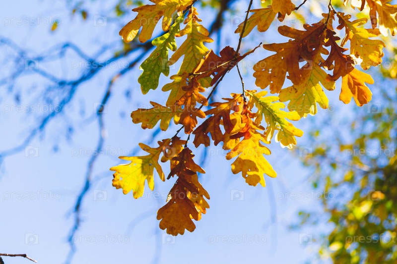 Желтые осенние листья на дереве ярко светятся в солнечных лучах