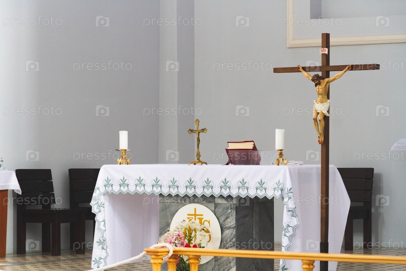 Внутри храма. Церковная атрибутика. Библия в церкви. Место для молитвы