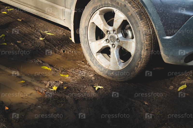 Лужи и грязь после сильного дождя. Затопленная территория со следами автомобилей