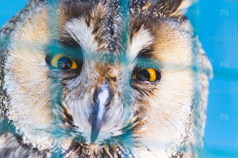 Совы в клетке в зоопарке. Сова на открытом воздухе. Милая сова сидит на ветке