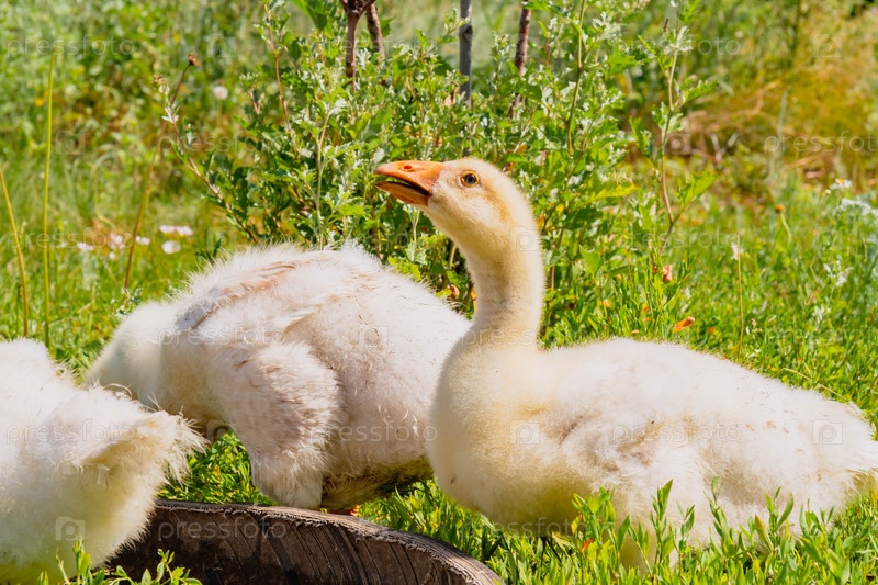 Гослинг. Птицефабрика по разведению гусей. Маленькие гусята в траве