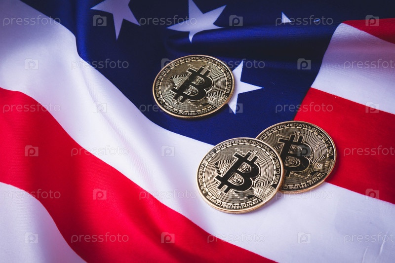 Биткойны в США. Запрет криптовалюты в Америке. Флаг США и биткойн-монета