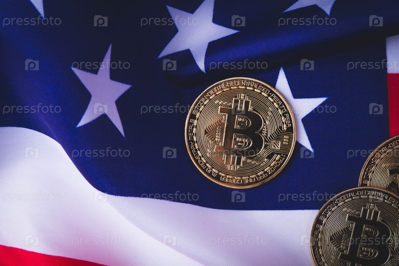 Биткойны в США. Запрет криптовалюты в Америке. Флаг США и биткойн-монета