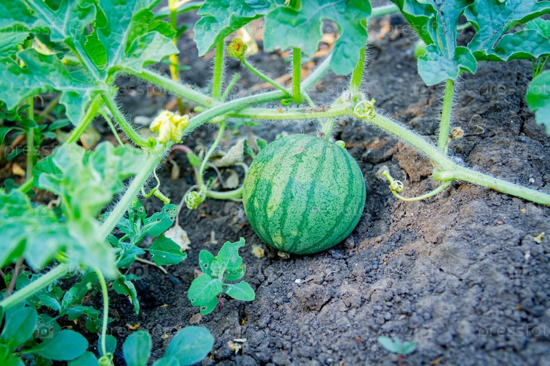 Маленький арбуз на ветке. Арбуз в поле на земле