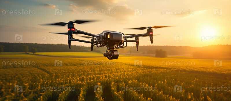 Дрон-квадрокоптер на зеленом кукурузном поле